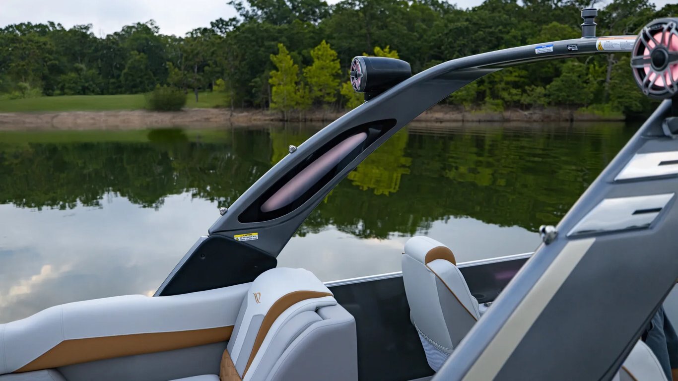 Custom-matched to the fence with a glossy finish, the arch combines style and function. JL Audio M6 7.7″ tower speakers deliver premium sound. A built-in tow point makes skiing easy, and the bimini canvas with nav lights provides shade and safety on the water.